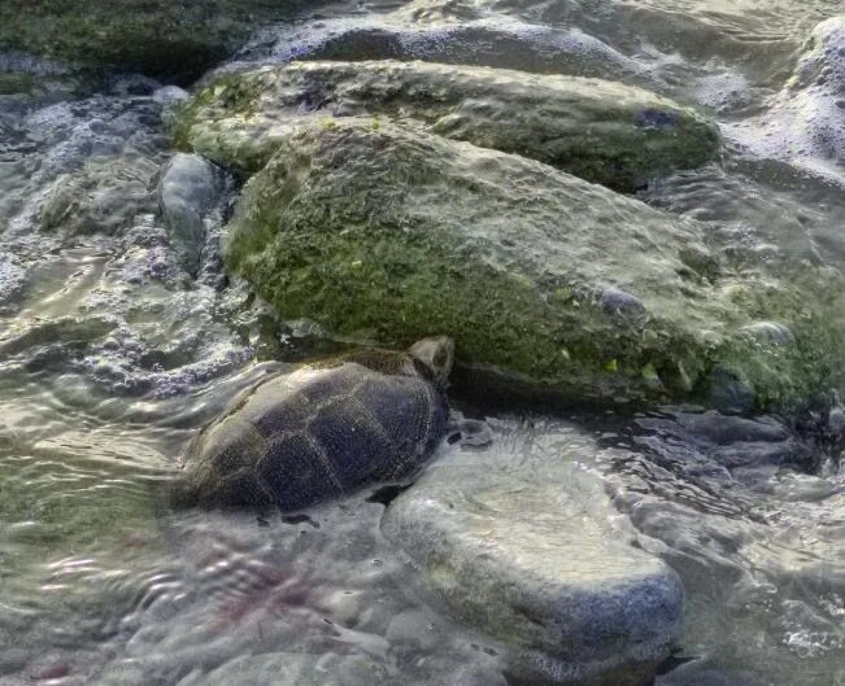 Это же обычная степная черепаха! Это не водяная черепаха. Запугали её и загнали в море