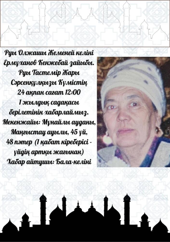 руы-Тастемір-Жары, Анамыз Сәрсенқұлқызы Күмістің, 24-ақпан 1-жылдық садақасы берілетінін хабарлаймыз.