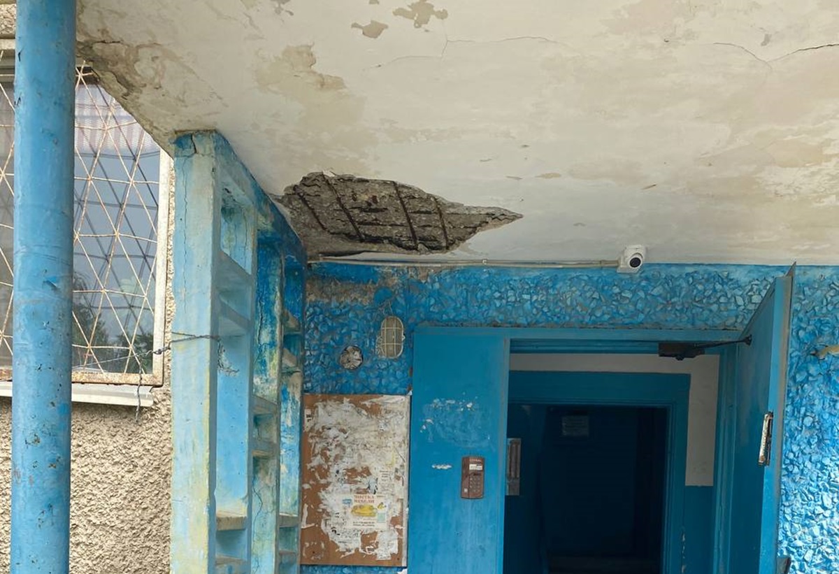 Часть козырька из бетона обрушилась в 7 доме 13 микрорайона.