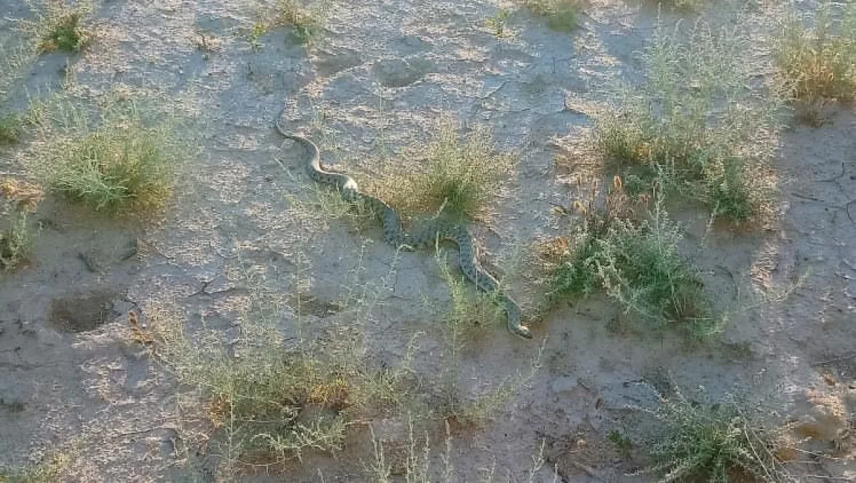 Сегодня в степи видели вот такую змею, по окраске, языку и отсутствию жёлтых пятен на голове, и поведению, она полностью похожа на смертельно ядовитую гюрзу – самую опасную змею на территории бывшего СССР.
