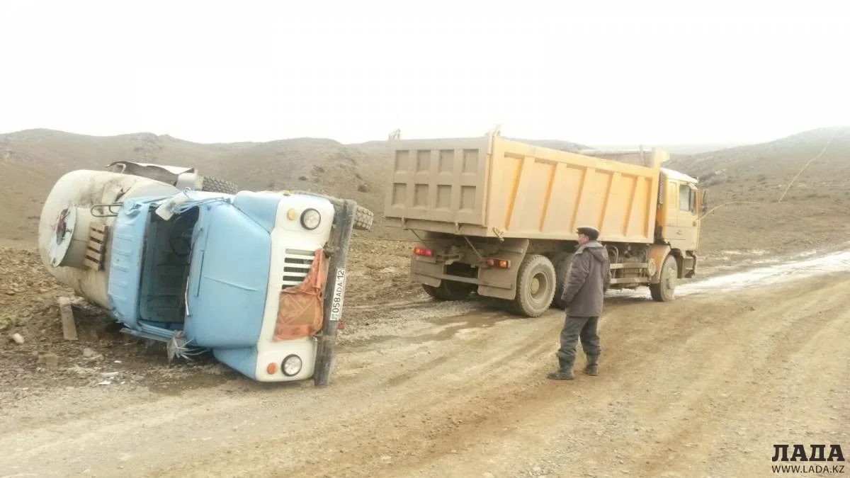 По дороге в Отпан тау 13 марта около на спуске, не справившись с управлением, водитель водовоза опрокинул свое транспортное средство. Вроде все живы здоровы. Будьте осторожнее