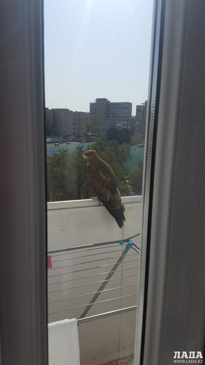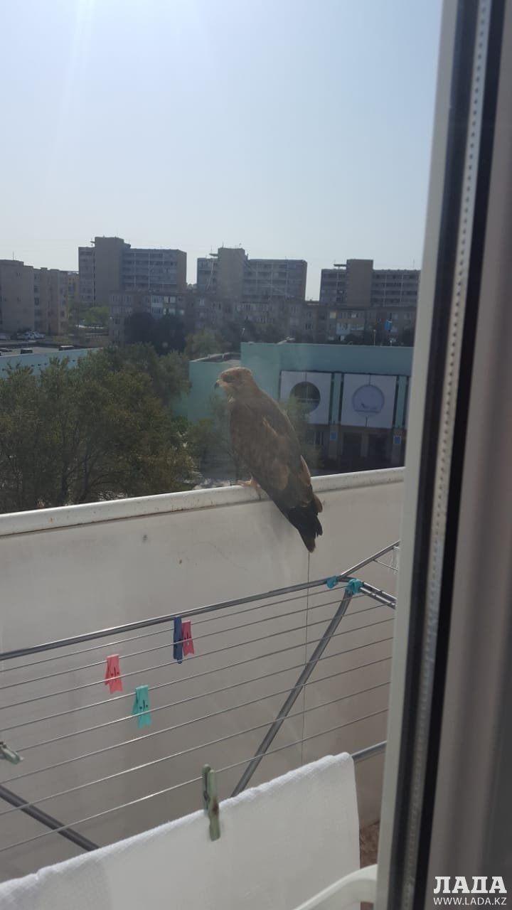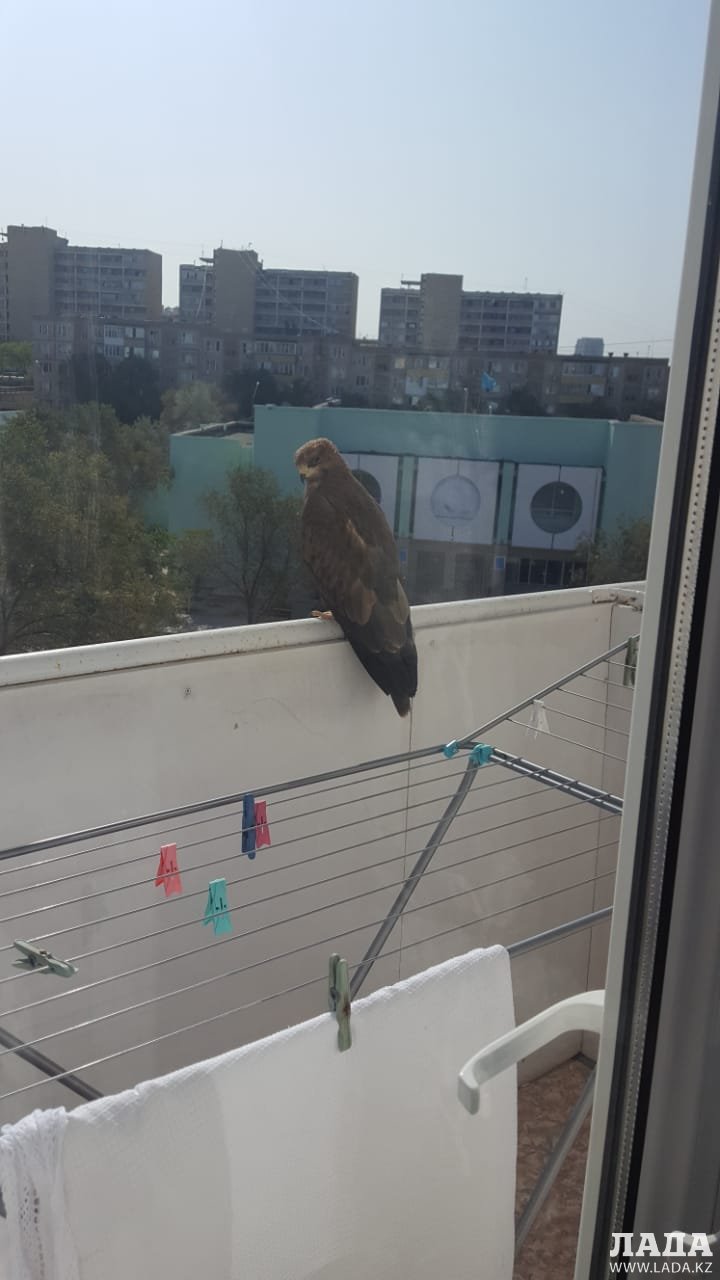 Это осоед - пролетная у нас птица. Видимо, нашел у вас на балконе удобное место для наблюдения или для отдыха.