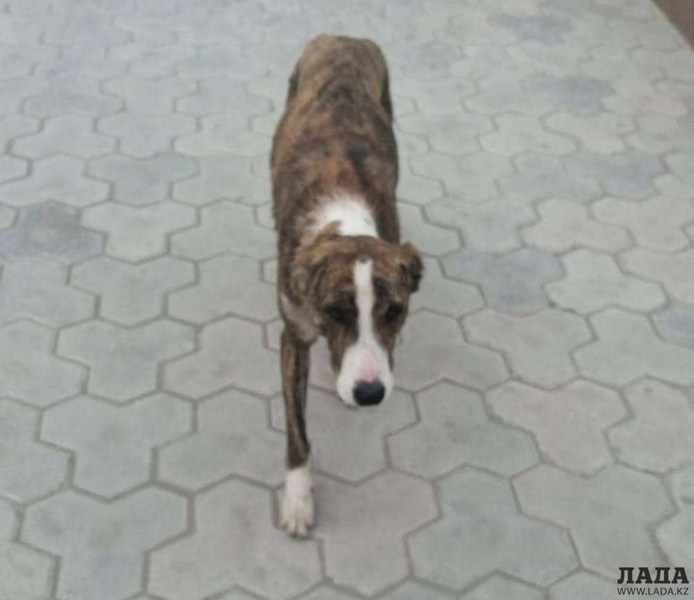 Собака тигровой окраски с купированными ушами и хвостом гуляет возле торгового центра «Жигер» в поисках пищи и мягкого местечка.