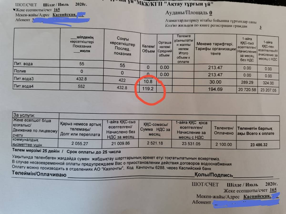 Здравствуйте. Хотела попросить вас разместить информацию, что происходит с начислением за воду в пос. ПРИМОРСКИЙ. Жировки за май и июнь пришли с нормальными адекватными цифрами. В июле приписали больше ста кубов. Мы месяц размышлял куда мы, вообще, могли потратить такой объ ем воды. И вчера, случайно, разговаривая со знакомыми, узнали, что мы не одни такие. У очень многих именно за июль такие приписки по воде. Счётчики у нас установлены на улице в колодцах, не на территории частных домов, поэтому обслуживающая компания "Ақтау тұрғын үй" вольна делать все, что угодно. Сравнили счётчики в колодце и опламбировки своего и рядом стоящего счётчика(который не подключён к потребителю) . На нашем счётчике видно свежая проволока для опломбировки без ржавчины, а на рядом стоящем счётчике вся ржавая. Оказывается приписки по посёлку массовые, не только у нас, люди уже возмущаются. Случаи приписок, про которые мы знаем, на ул. Прохладной, Целинной и др.
