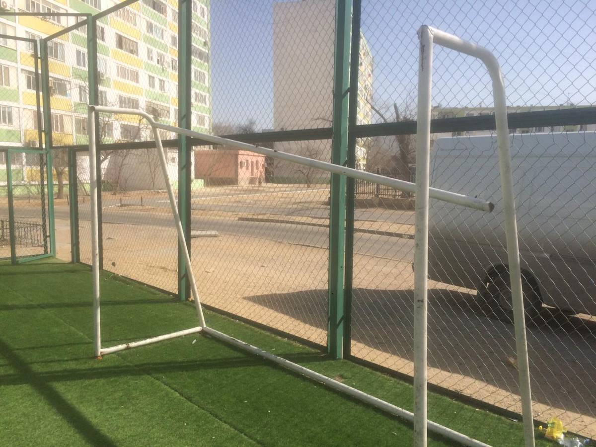 Футбольные ворота, которые должны были заменить, оставили старые. Ремонтники произвели сварку, где нужно, подкрасили и установили обратно.