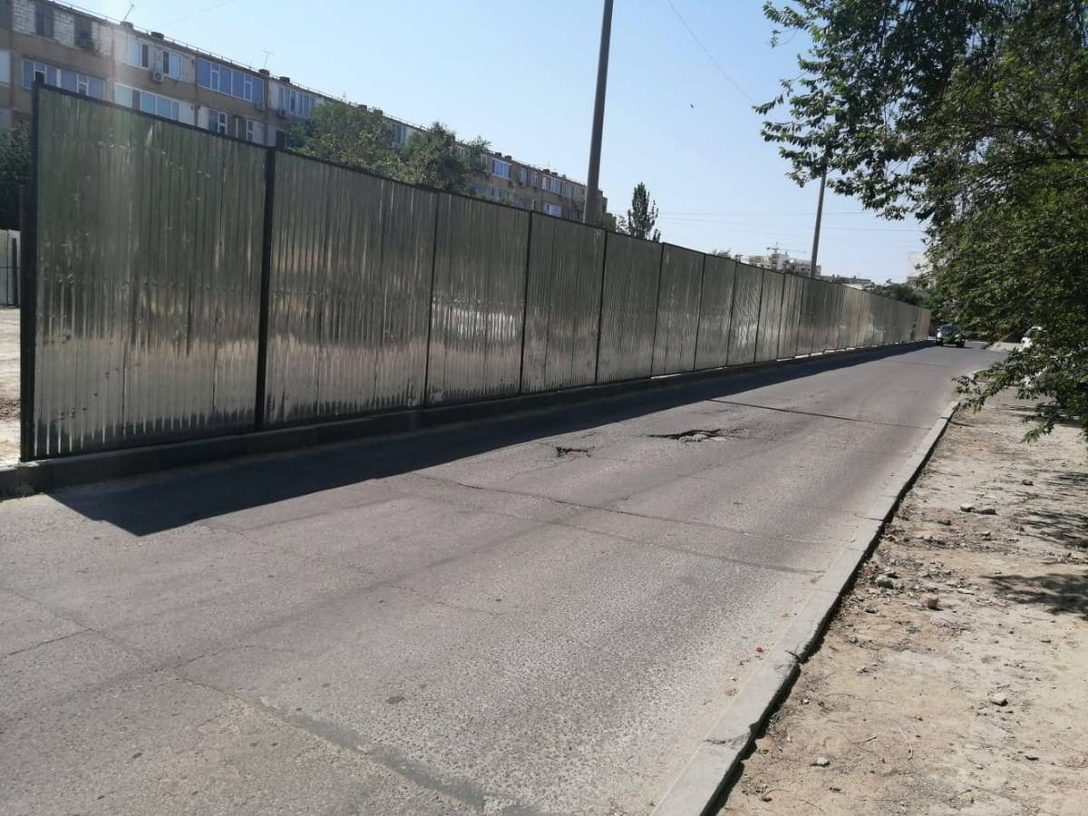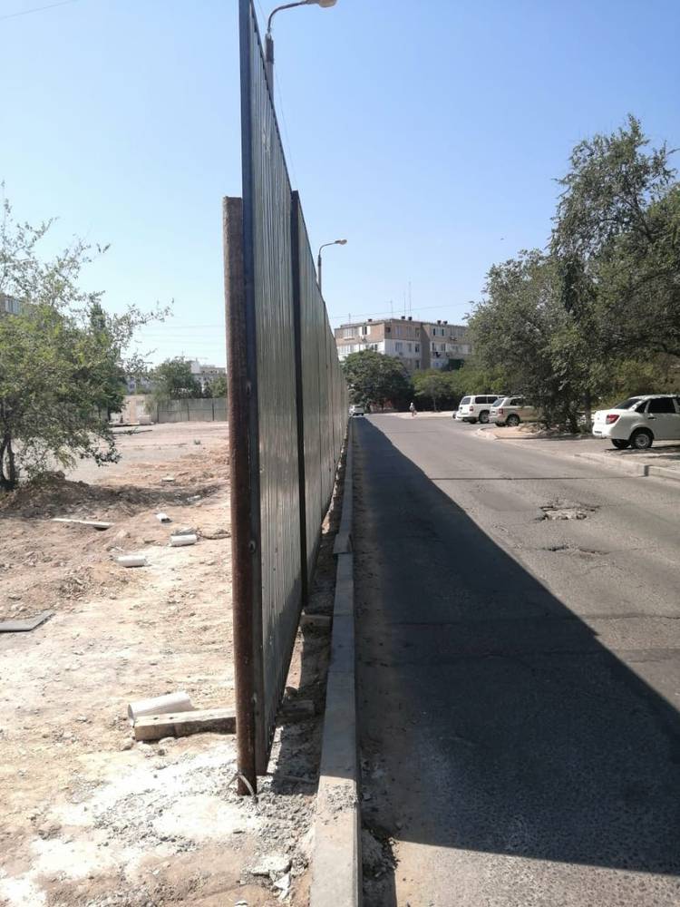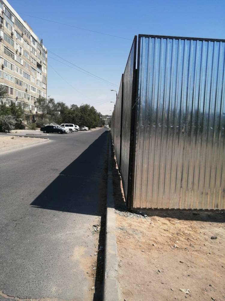 Давайте посмотрим с другой стороны стройки. Тут забор установлен в плотную к дороге. Очень сильно сомневаемся что и тут все в порядке. Явно не соблюдены правила безопасности. На этом участке прямой дороги обычно машины едут быстрее обычного, есть место где разогнаться, затем поворот. Если ехать со стороны школы, из-за забора за поворотом пространство не просматривается, а там как раз пешеходная тропинка. Помимо этого, сам забор зеркалит солнце и здорово так слепит. Что думает по этому поводу Жол Пол? Тут тоже будем ждать происшествий?
