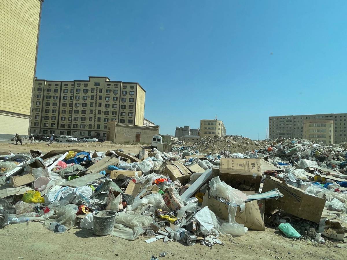 Бытовой мусор выносят из ЖК «Аскар Тау» и ЖК «Раяна», так как там нет мусорного контейнера, видимо, из-за того, что не все жильцы там поселились. Но из-за этого страдают соседние жилые дома: вонь, насекомые. Дети там играют. И это в центре города.