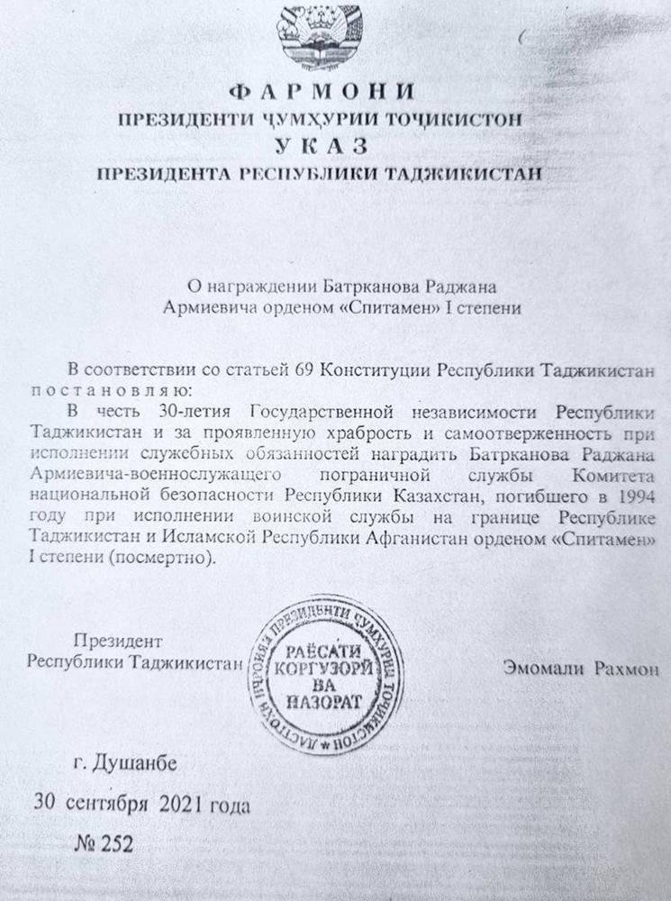 Указом президента Республики Таджикистан Э.Рахмона №252 от 30 сентября 2021 года в честь 30-летия Государственной независимости Республики и за проявленную храбрость, самоотверженность при исполнении служебных обязанностей младший сержант Батрканов Раджан Армиевич награждён орденом «Спитамен» 1 степени (посмертно).