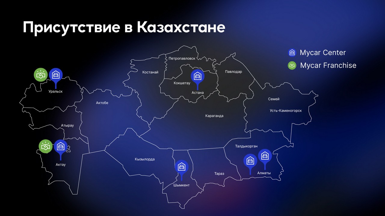 На сегодняшний день в Казахстане успешно функционируют шесть автоцентров Mycar.kz (два – в Алматы и по одному автоцентру в городах Астана, Шымкент, Уральск и Актау).