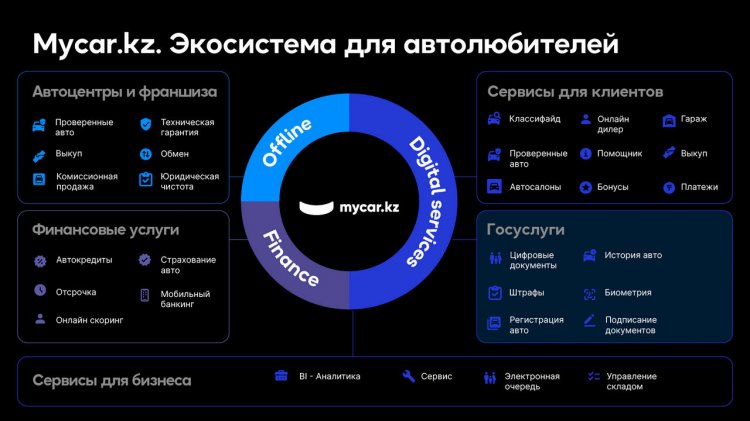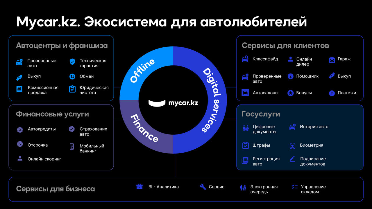 Mycar.kz – это экосистема, которая состоит из приложения, автоцентров, микрофинансовой организации и системы по автоматизации бизнеса. Все продукты бренда доступны через приложение, где можно выбрать автомобиль, получить предварительное одобрение на автокредитование, записаться на сервис или технический осмотр и продать автомобиль через классифайд (онлайн-витрина объявлений).