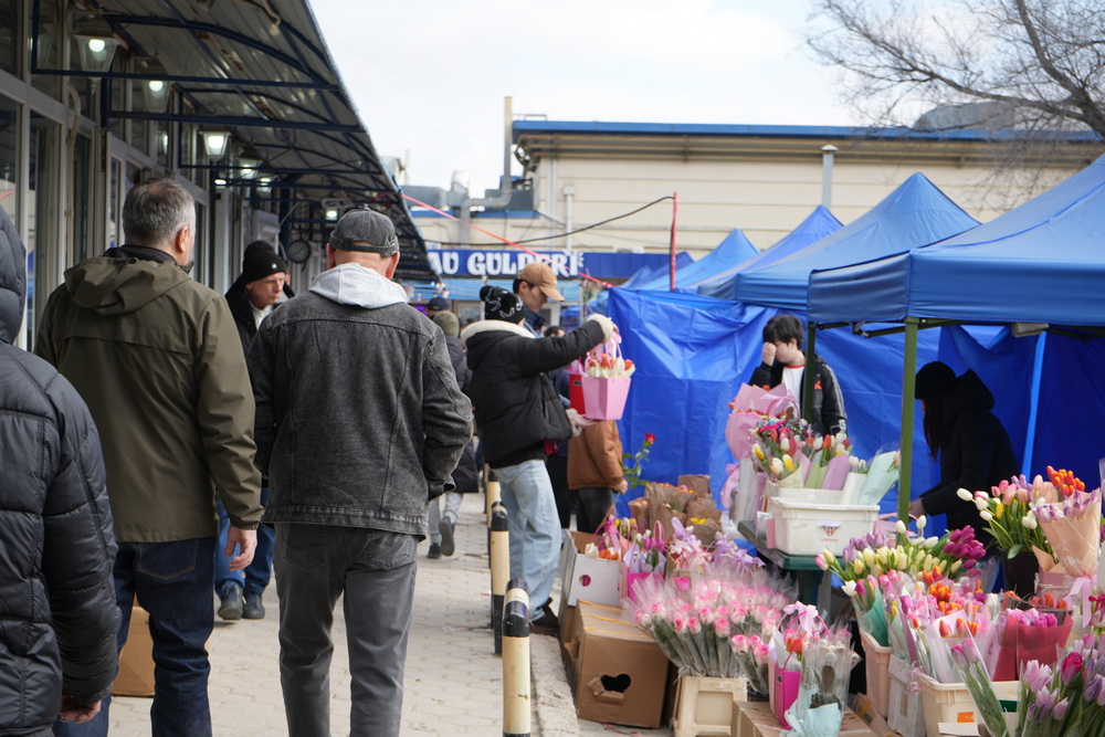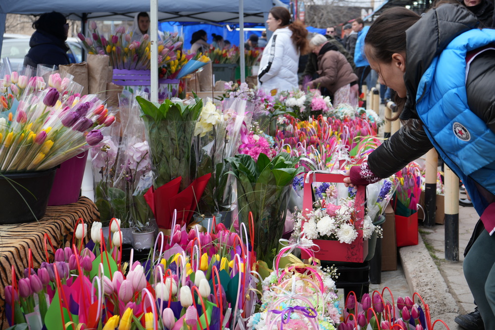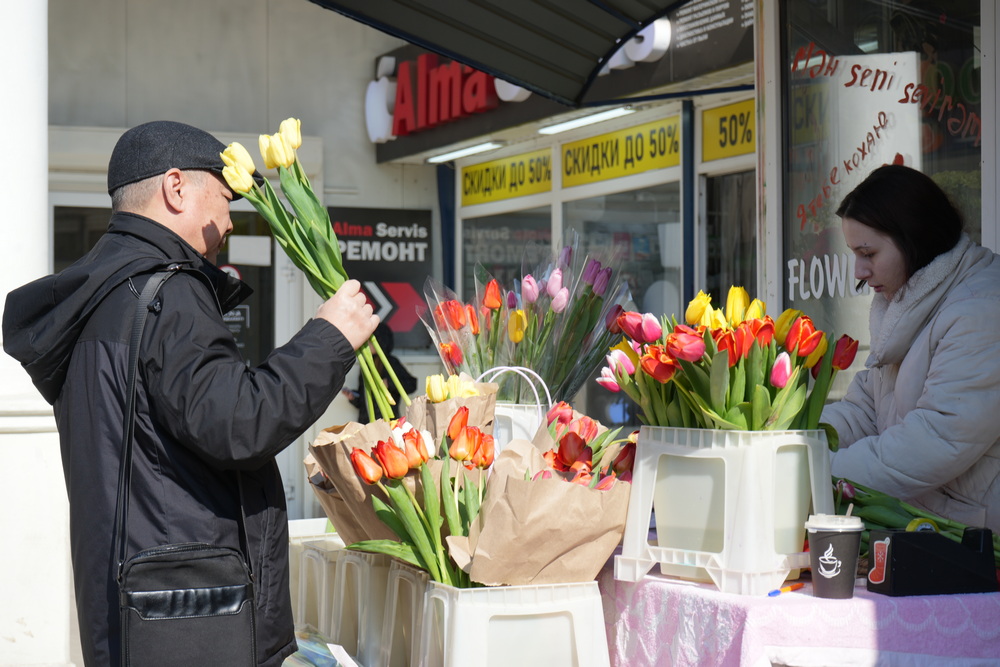 У цветочных рядов, расположенных в разных частях города, было непросто пройти – палатки с цветами заполнили торговые площади. Продавцы предлагают самые разные композиции: от небольших букетов тюльпанов до больших праздничных корзин.