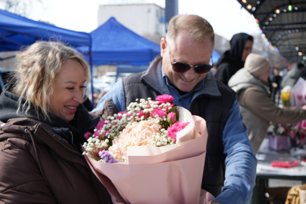 Некоторые жители города поздравляют своих близких прямо у цветочных рядов, вручая букеты сразу после покупки.