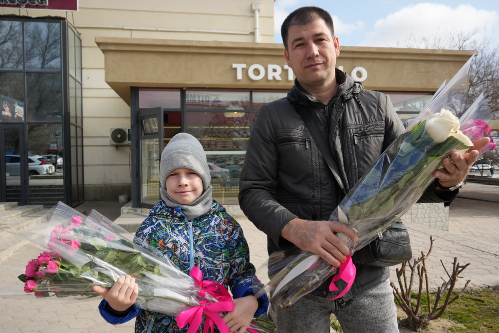 Местный житель Сергей пришел за цветами вместе с сыном Евгением. Они выбрали сразу шесть букетов – для родственниц и близких знакомых.