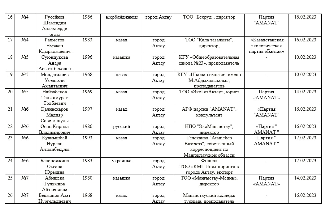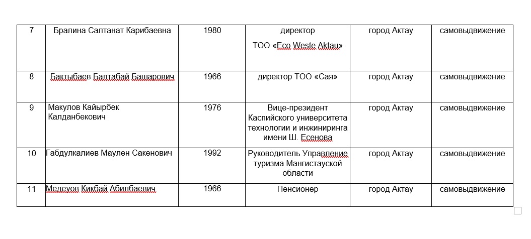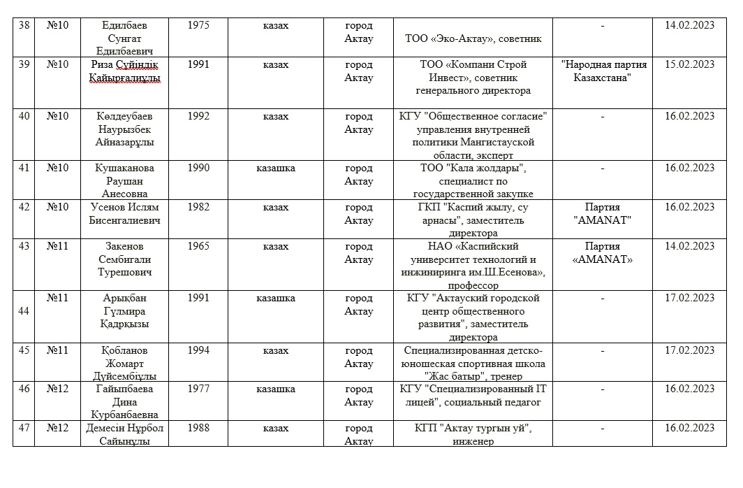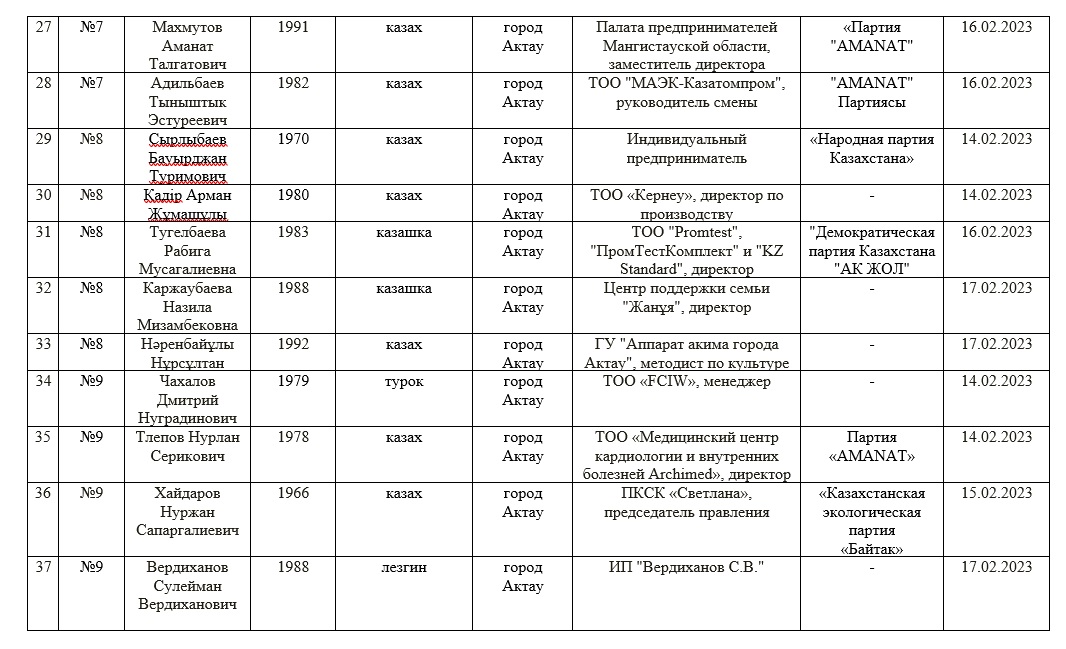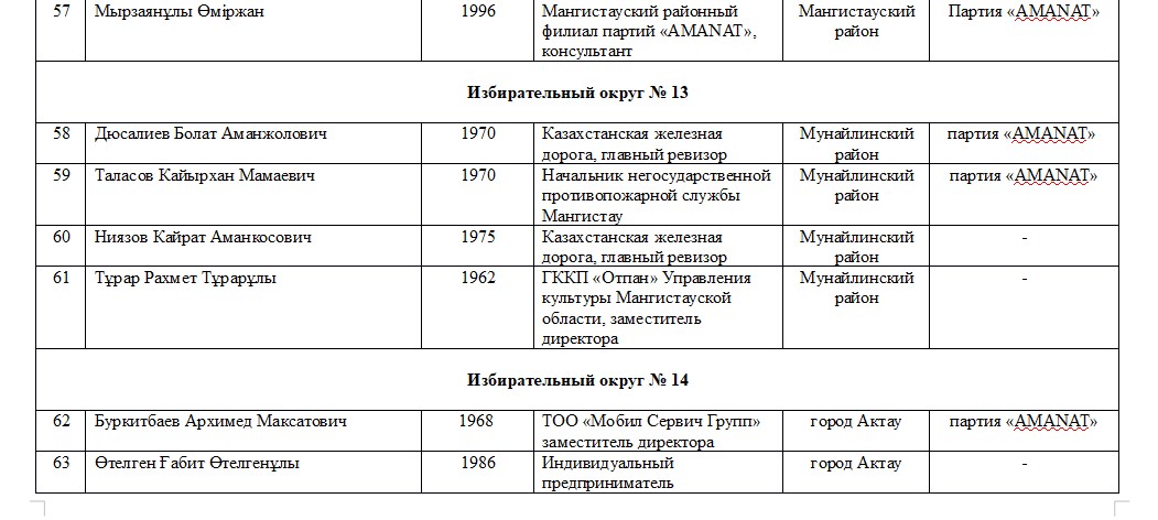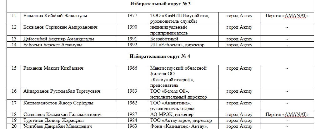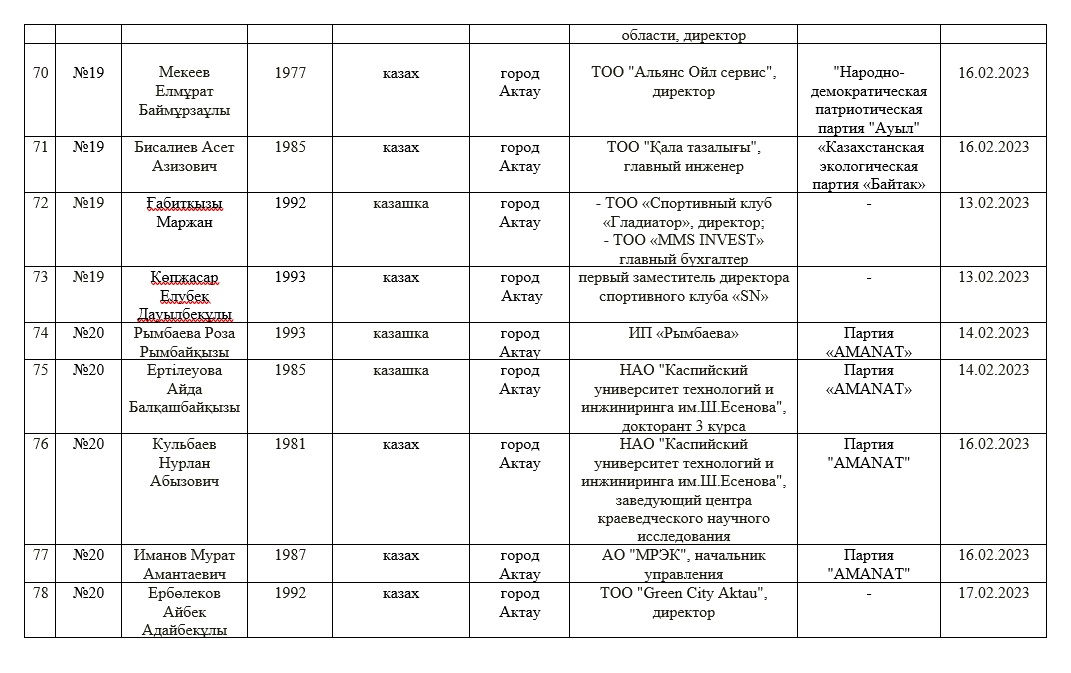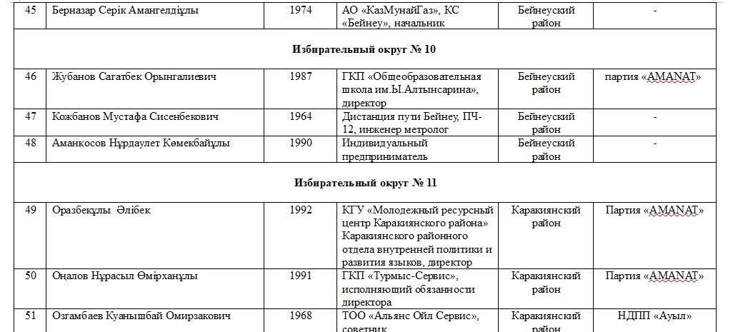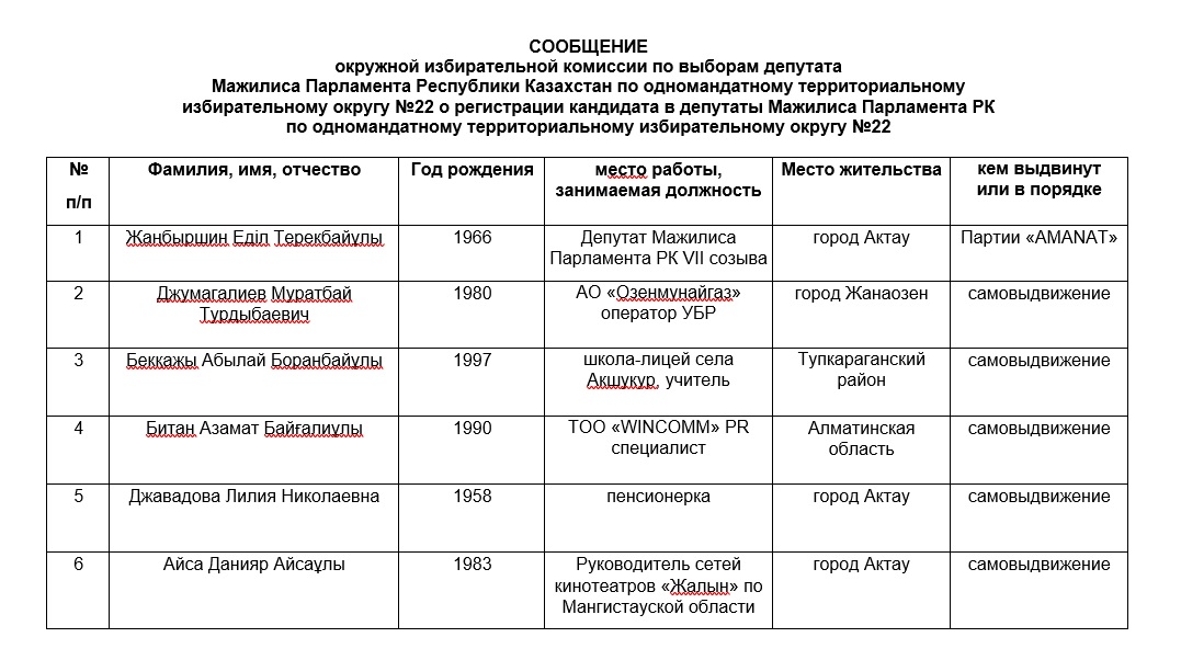 По данным областной избирательной комиссии, из Мангистау в депутаты Мажилиса Парламента Республики Казахстан выдвинуто 11 кандидатур: один от политической партии «AMANAT» и 10 человек - самовыдвиженцы.