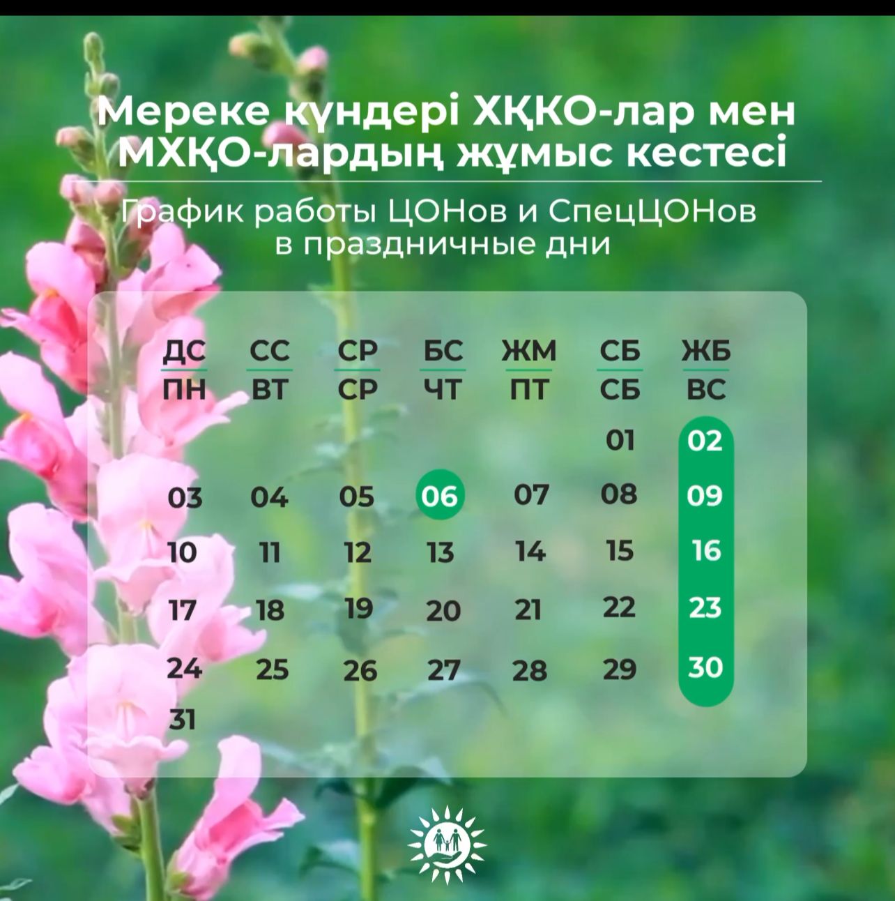 - В связи с предстоящими праздниками ЦОНы и спецЦОНы Казахстана не будут работать 28 июня и 6 июля. 7 и 8 июля до 13:00 будут принимать граждан только дежурные ЦОНы и спецЦОНы. Кроме того, 1 июля будет рабочим днем для обычных и специализированных центров обслуживания населения страны. В этот день ЦОНы будут принимать граждан до 18:00, спецЦОНы до 20:30, - отметили в пресс-службе.