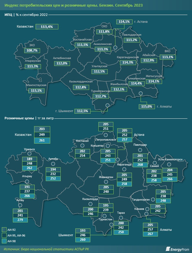 В региональном разрезе сильнее всего по кошелькам граждан ударили цены на бензин в Алматы: плюс 15 процентов к сентябрю прошлого года. В тройке антилидеров также оказались Алматинская и Карагандинская области: плюс 14,4 процента и плюс 14,3 процента соответственно.