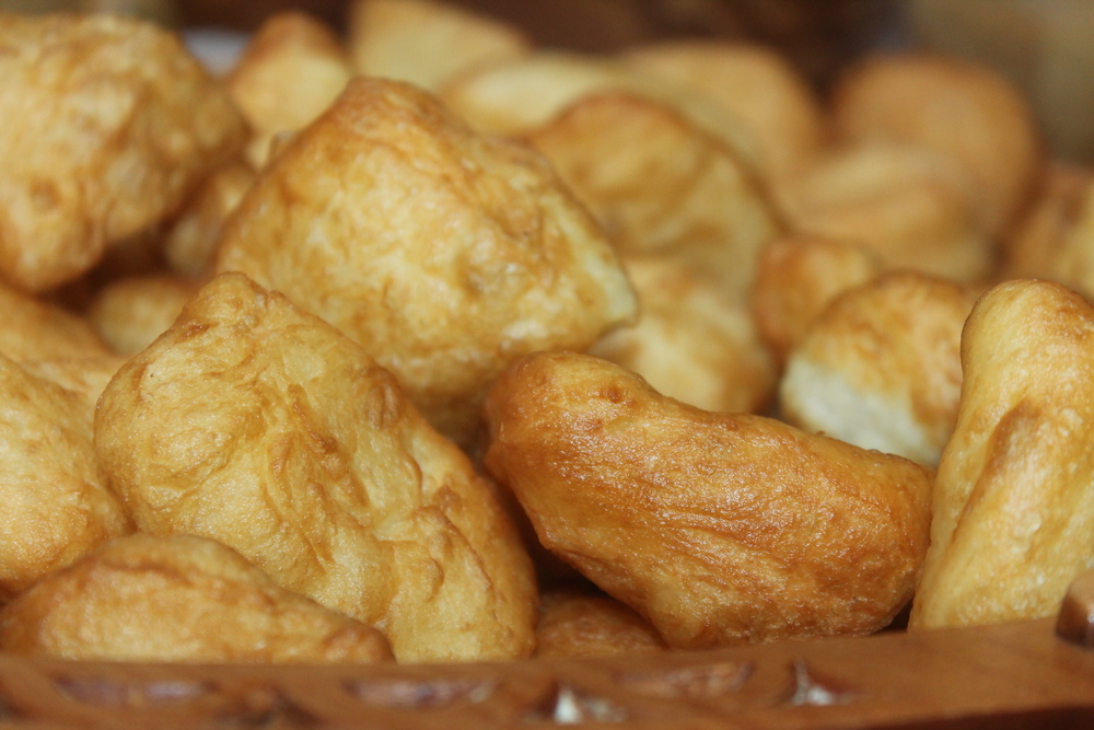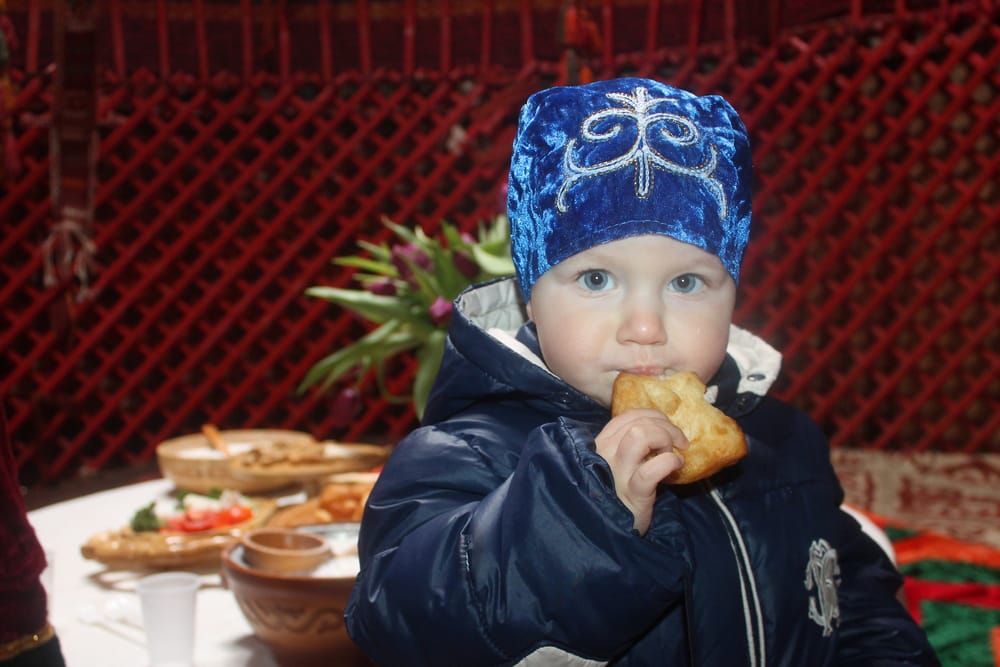 А вот малыш в национальном узорном платке с удовольствием уплетает ароматный бауырсак.