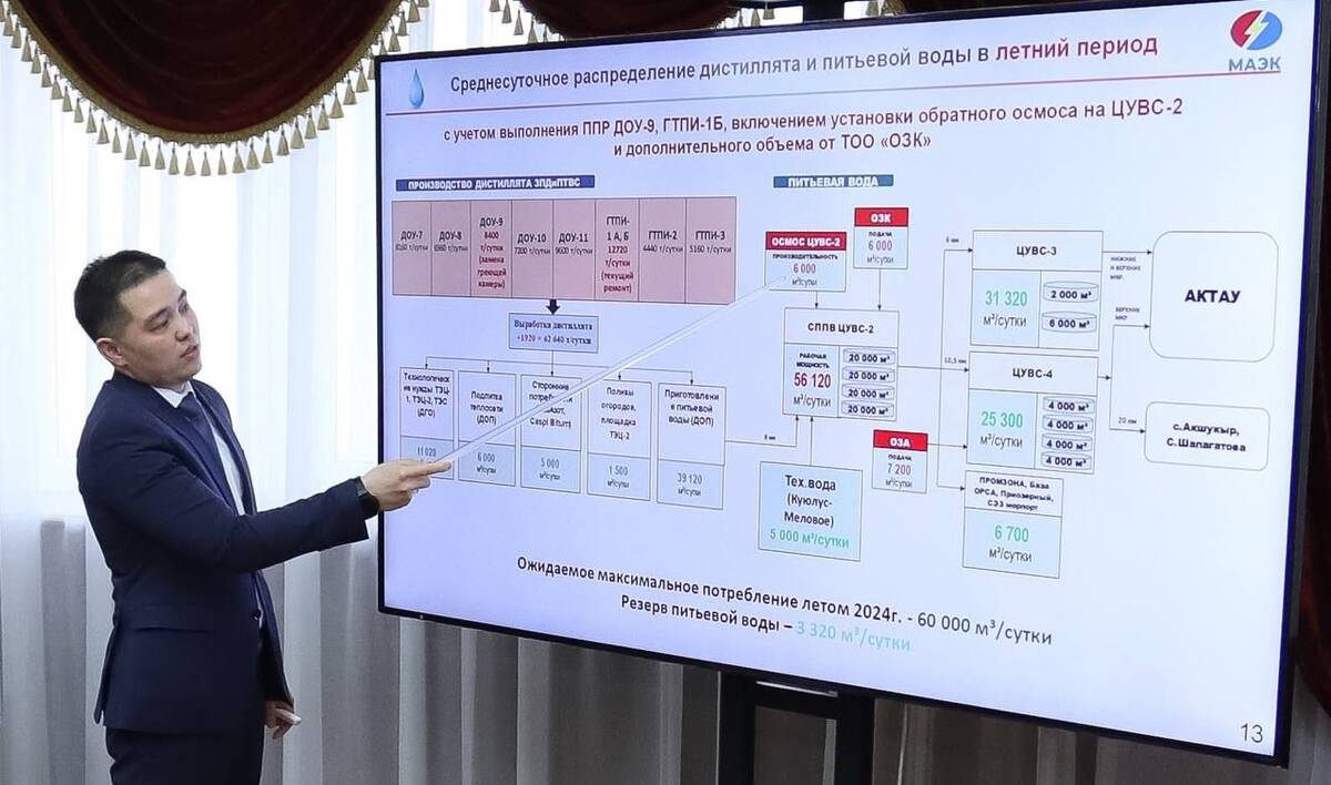 В своем выступлении Абдеш Туркменбаев заявил, что в летний сезон 2024 года в регионе планируется снизить уровень дефицита воды с 77 тысяч кубических метров в сутки до 11 тысяч кубических метров в сутки. Это планируется сделать возможным при условии увеличения производительности опреснительных установок в селах Саин Шапагатов, Баянды, Акшукур, а также на опреснительных заводах в Актау, Форт-Шевченко, Кендерли, на месторождении Каражанбас за счет водопровода «Астрахань-Мангышлак» и Мангистауского энергокомбината.