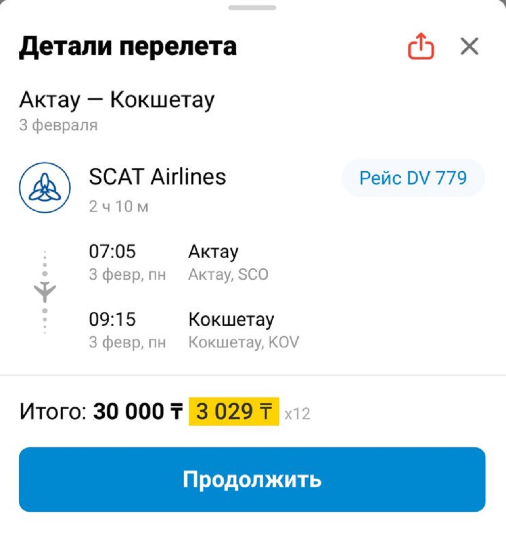 Стоимость билета в одну сторону Актау — Кокшетау составляет 30 000 тенге.