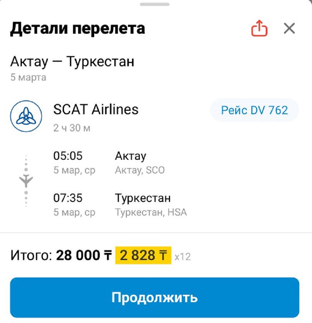 Билеты на рейс Актау – Туркестан стоит 28 000 тенге в одну сторону.