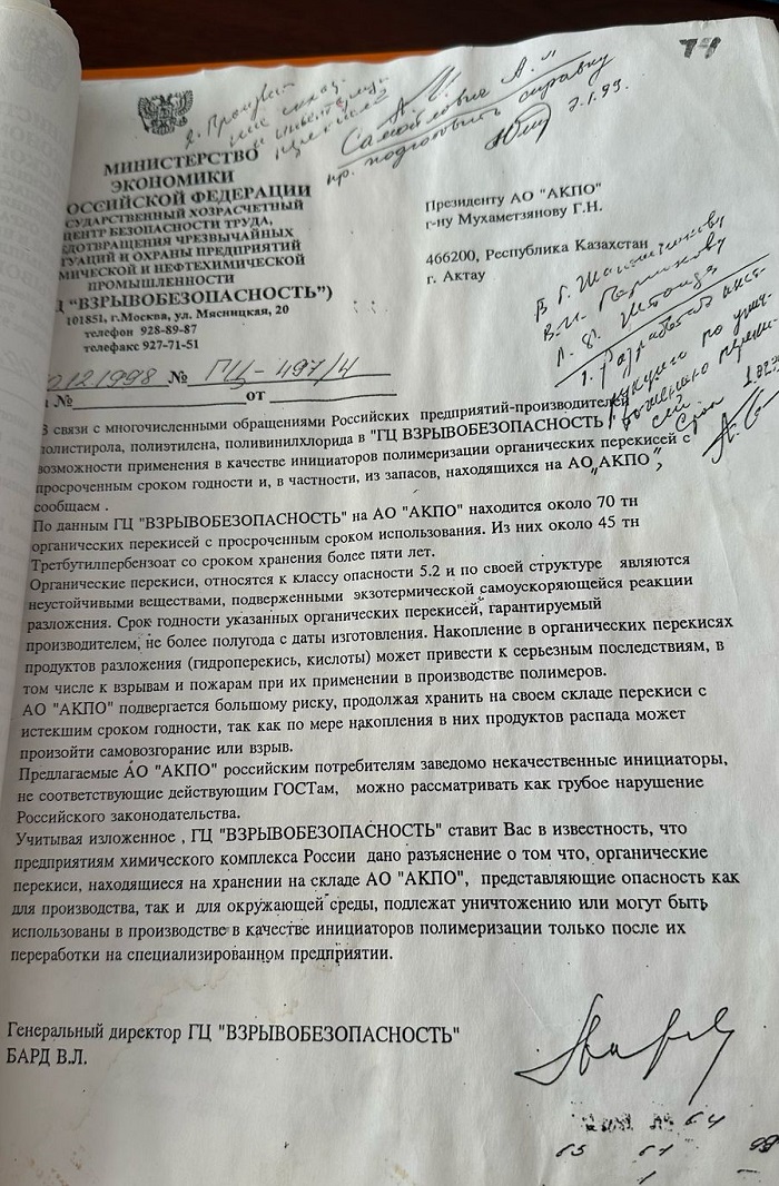 Там в девяностых годах хранилось 75 тонн взрывоопасных перекисных соединений. Сроки хранения этого вещества давно истекли. Опасность самопроизвольного разогрева пероксидов с последующим взрывом была очень велика. Если бы все хранившиеся на заводе пластмасс перекисные соединения взорвались, сила взрыва могла составить 74,5 тонны в тротиловом эквиваленте, - говорит Кажимурат Хайрушев.