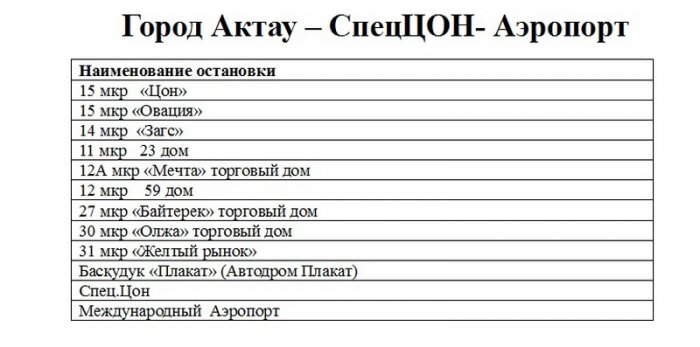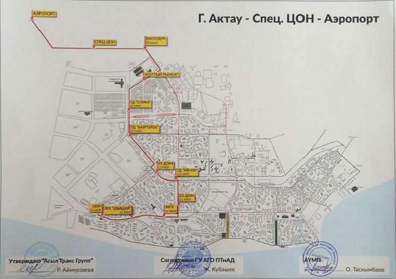 Автобус проследует через 14,11,12 микрорайоны, торговый дом «Олжа», Желтый рынок и поселок Баскудук до специализированного автомобильного ЦОНа, конечная остановка - аэропорт Актау.