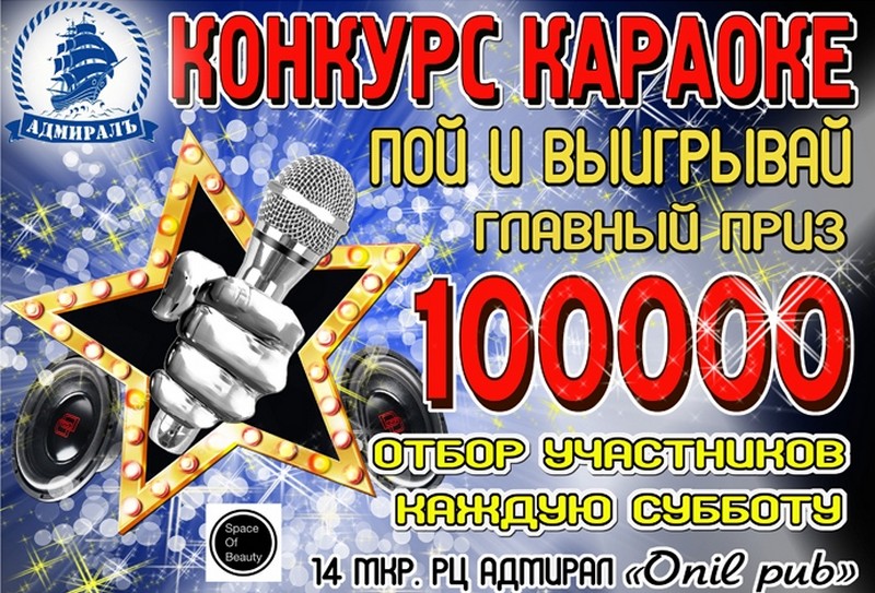 Развлекательный центр «Адмирал» приглашает любителей и профессионалов участвовать в караоке-конкурсе! Оставьте заявку по телефону: 8 707 428 1601 и запишитесь на кастинг, который будет проходить каждую субботу апреля. Программа кастинга произвольная, но костюм, бэк-вокал и танцы приветствуются. Полуфинал пройдет 30 апреля. Финалисты будут определены при помощи жребия. Участники, которые пройдут в финал, должны будут точь-в-точь исполнить песню известного артиста. Финал состоится 1 мая. Не упусти свой шанс выиграть 100 000 тенге.