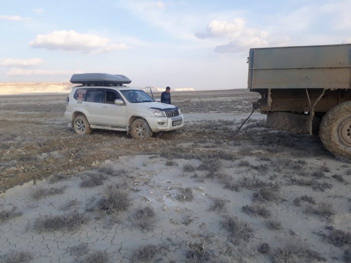 столкнулись с последствиями непогоды. Автомобиль Тoyota Prado увяз в грязи на размытой дороге рядом с урочищем Бозжыра.