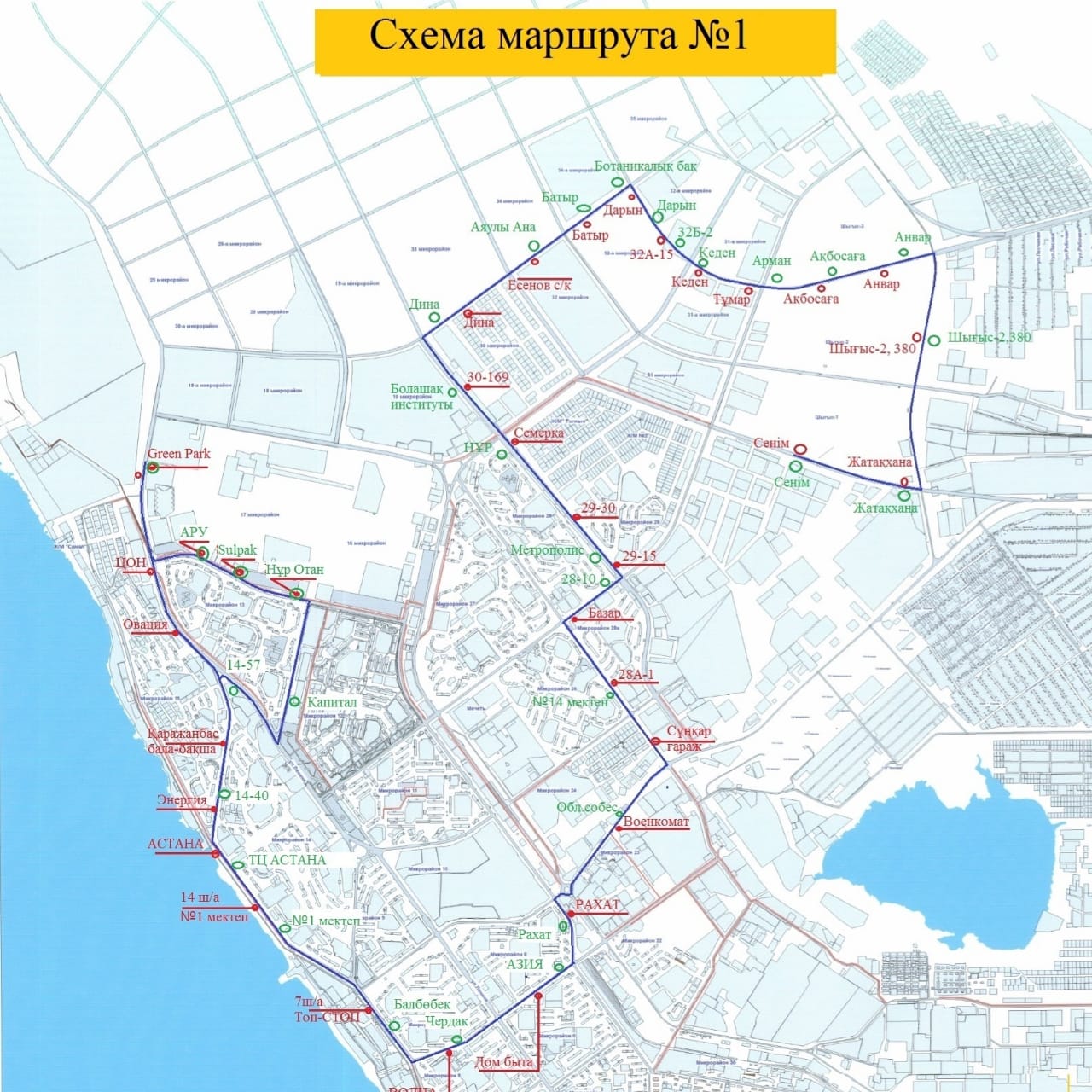Отправной точкой для маршрута №1 является поликлиника «Сенім» между микрорайонами 29А и Шыгыс-1. Маршрут завершает путь у жилого комплекса «Грин Парк» в 17 микрорайоне. Об этом сообщили в акимате Актау.