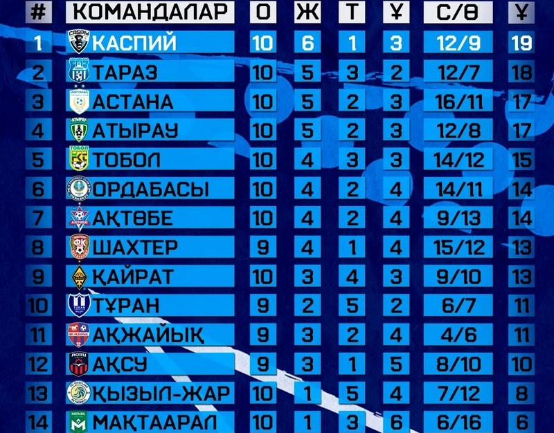 После X тура наша команда занимает первое место в турнирной таблице с 19 очками. Следом за ней команда «Тараз» - 18 очков. Замыкает тройку «Астана» с 17 очками.