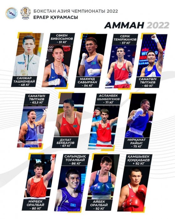 Казахстанский бокс также будут представлять: Санжар Ташкенбай (48 кг), Сакен Бибосынов (51 кг), Сабырхан Махмуд (54 кг), Серик Темиржанов (57 кг), Дулат Бекбауов (67 кг), Асланбек Шымбергенов (71 кг), Нурканат Райс (75 кг), Нурбек Оралбай (80 кг), Сагындык Тоганбай (86 кг), Айбек Оралбай (92 кг) и Камшыбек Конкабаев (+92 кг).