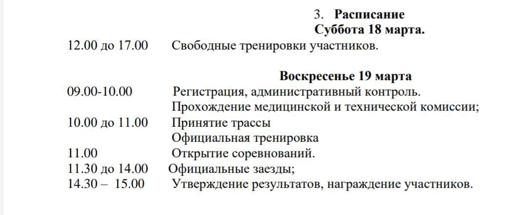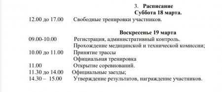 Открытие соревнований запланировано на 11:00. Официальные заезды пройдут с 11:30 до 14:00. Подсчет результатов и награждение участников намечено на 15:00. В субботу, 18 марта, на этой же трассе пройдут свободные тренировки участников.