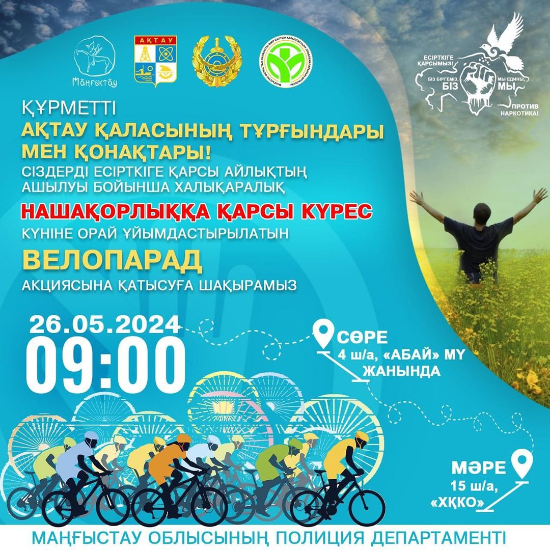 Управлением по противодействию наркопреступности департамента полиции Мангистауской области 26 мая будет проведен велопробег. Приглашаем жителей и гостей города принять участие в мероприятии!, - сообщили в ведомстве.