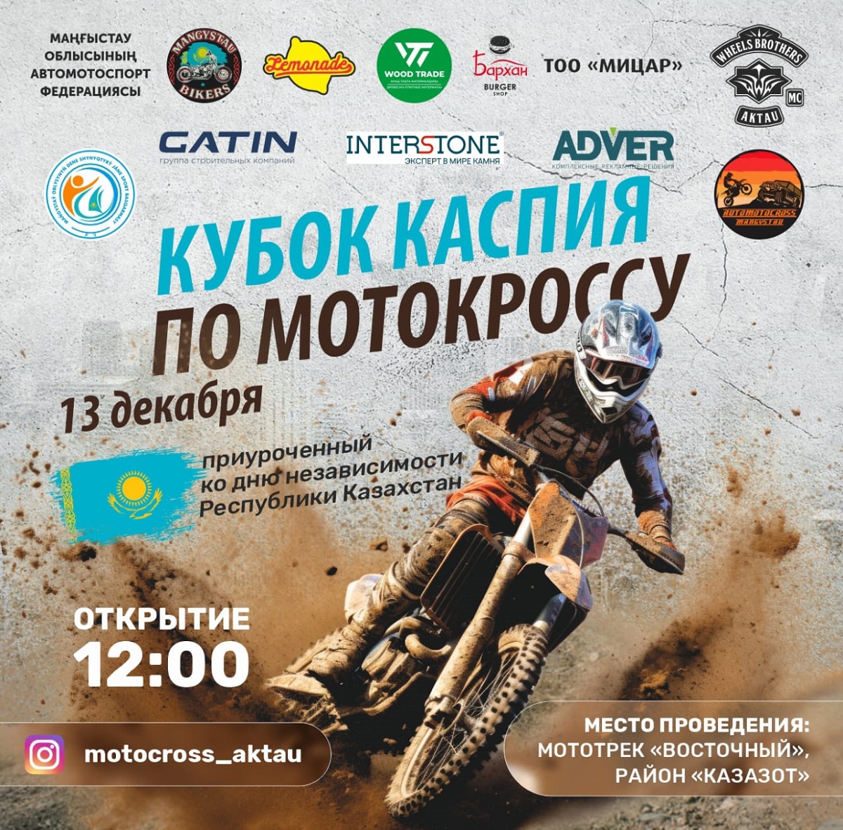 Мотокросс «Кубок Каспия» состоится в Актау 13 декабря на территории мототрека, как и планировалось. Организаторы соревнований приглашают жителей города поддержать спортсменов, передает Lada.kz.