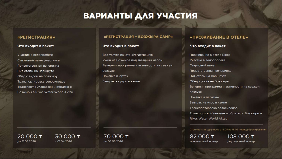 После финиша в визит-центре Бозжыра участникам будет предоставлено время для душа, переодевания и обеда. В 15:40 состоится сбор и выезд в Актау для тех участников, кто не остаётся в кэмпе.