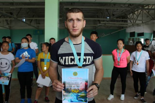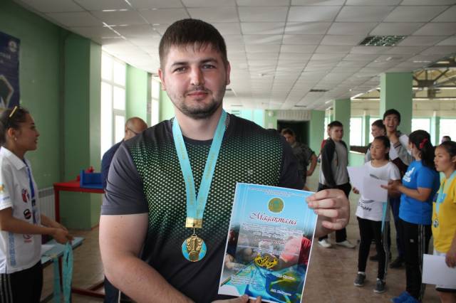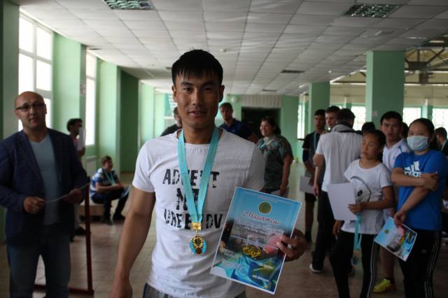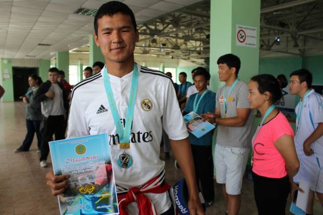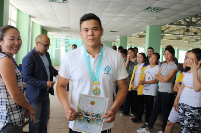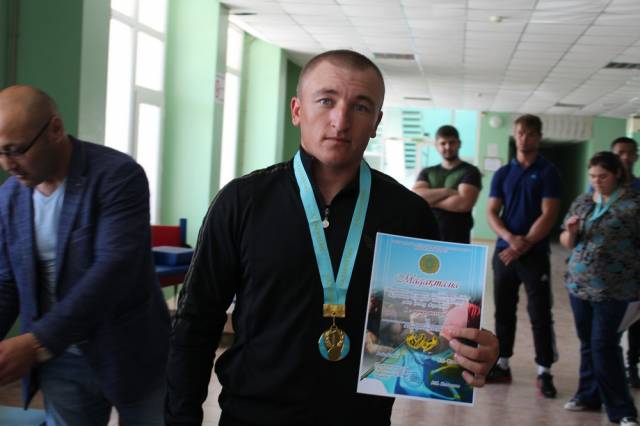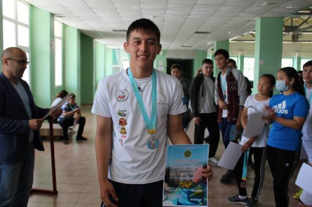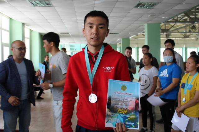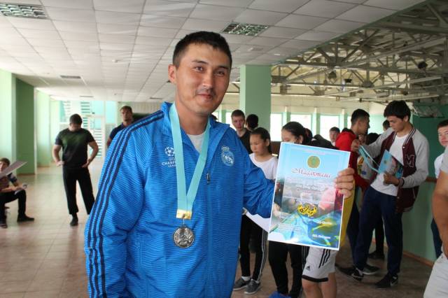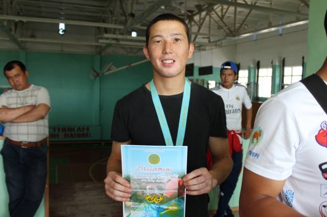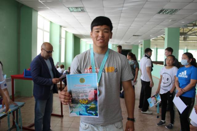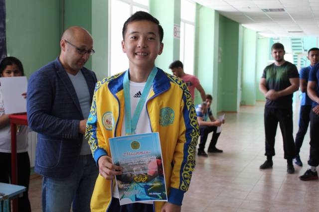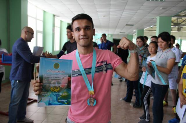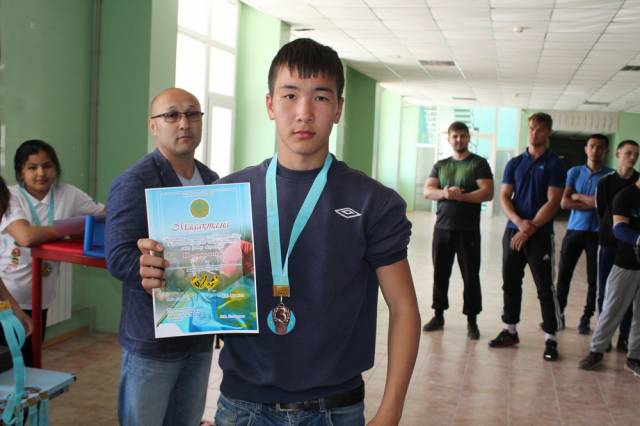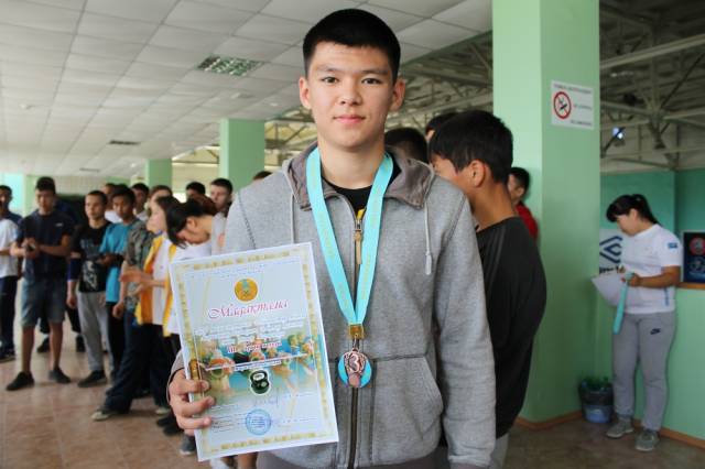 Нуркен Айткали, ученик 10 класса средней школы №11, победитель соревнований в весе 95 килограммов
