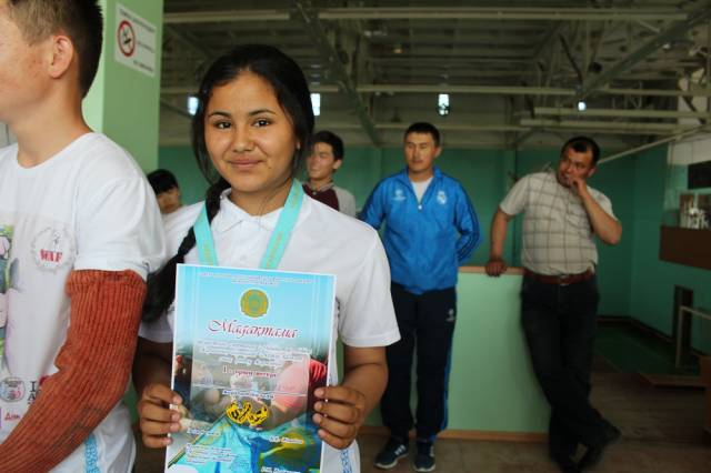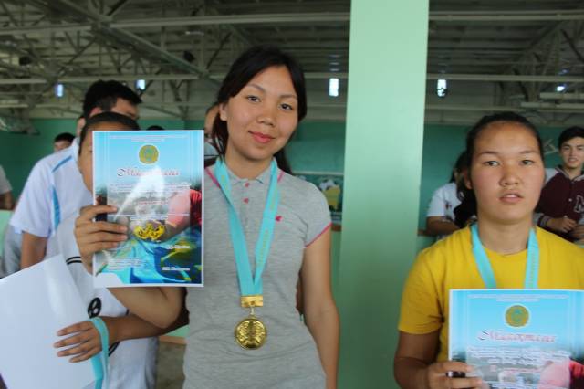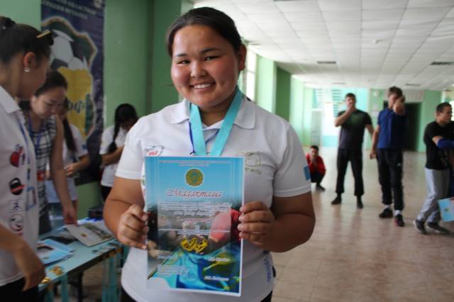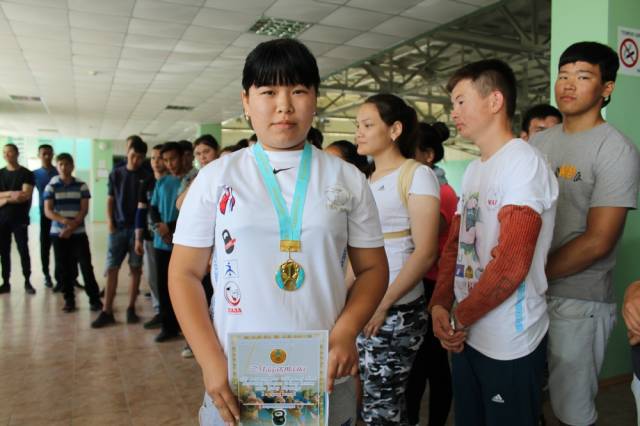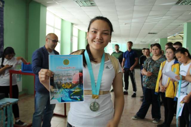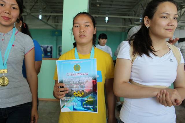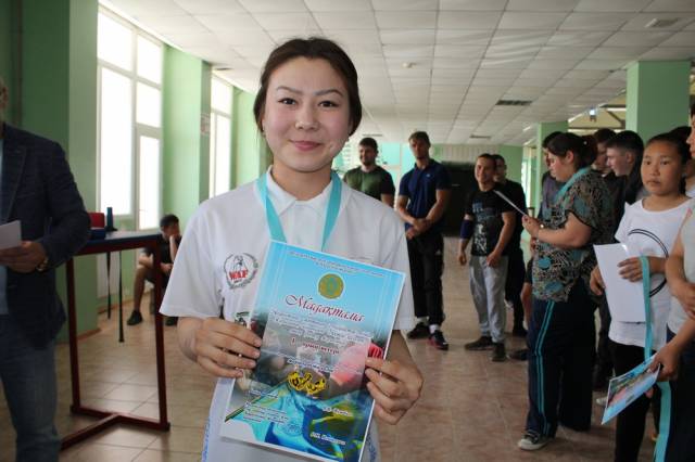 Первое место в поднятии 16-килограммовой гири среди девушек поделили Жанна Ергалиева (58 кг) и Жазира Танатар (68 кг), защищавшие честь школы №9, а также Жанар Ерпанова из медицинского колледжа «Меирбеке» (63 кг) и Багила Ажибаева (+68 кг) из политехнического колледжа.