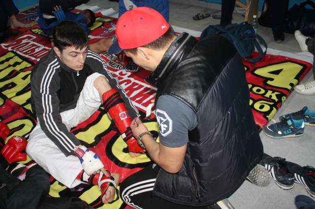 Очередная схватка 84 килограмма уральского 20-летнего бойца Саята «Рэмбо» Рамбай и 27-летнего Руслана «Руся» Джумагазиева из Жанаозена закончилась победой последнего. Он применил удушающий прием во втором раунде.