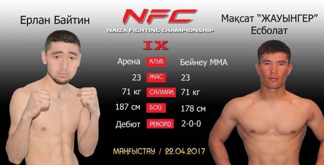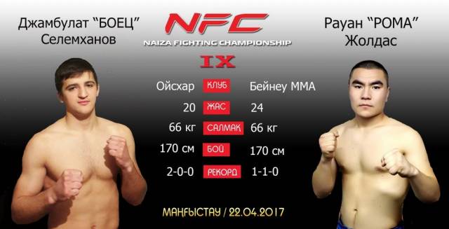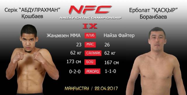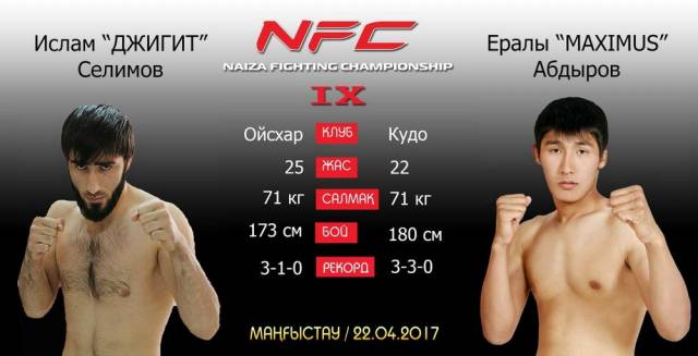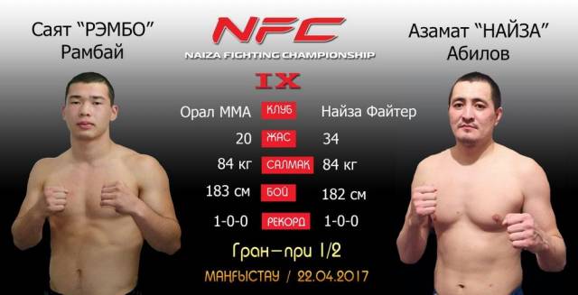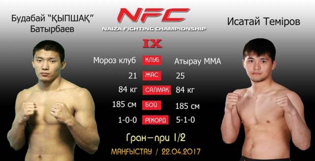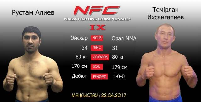 Из них два боя - за выход в финал NFC WEST в весовой категории до 84 килограммов. Главный бой вечера пройдет между Темирланом Ихсангалиевым, представителем Орал ММА (Казахстан), и Рустамом Алиевым, бойцом клуба Ойскар (Чеченская республика).