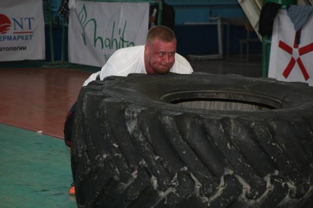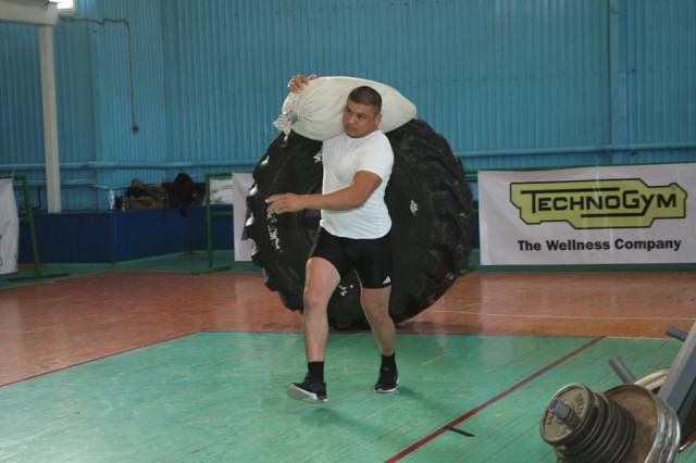 На первом этапе соревнований участники должны были 20 метров пронести 80-килограммовый мешок с песком. А на обратном пути - шесть раз перевернуть покрышку весом 360 килограмм.