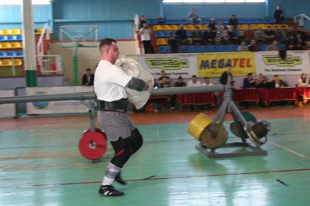 На следующем этапе каждый участник проходил 20 метров с «коромыслом» весом 320 килограммов.