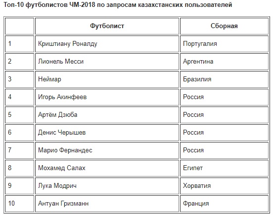 Самым популярным у казахстанцев футболистом стал Криштиану Роналду, представитель сборной Португалии. Второе место занимает Лионель Месси из сборной Аргентины. На третьем месте — Неймар из сборной Бразилии.