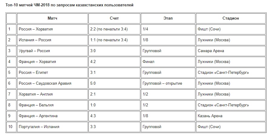 На первом месте в списке самых популярных у казахстанцев матчей значится встреча сборных России и Хорватии в ¼ финала. Матч прошел на стадионе «Фишт» в Сочи и закончился победой национальной команды Хорватии по пенальти (3:4).
