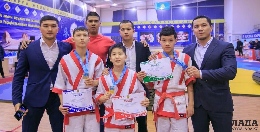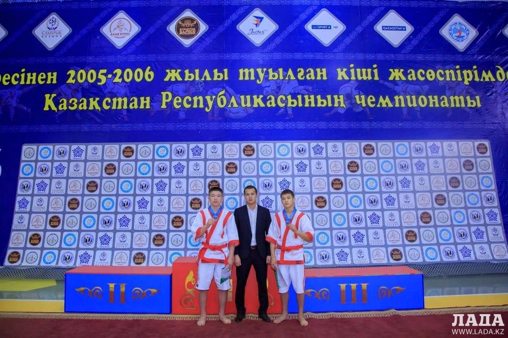 Жасулан Сайын и Ерасыл Машырык со старшим тренером Жаксылыком Меретжановым