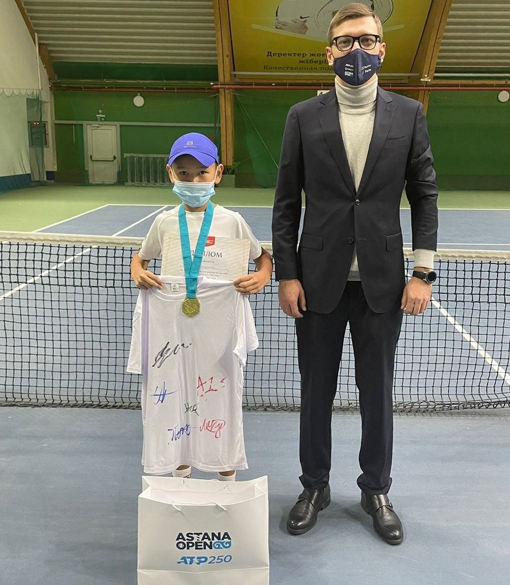 Помимо грамоты и медали, Нурдаулету вручили футболку с автографами игроков национальной сборной по теннису.