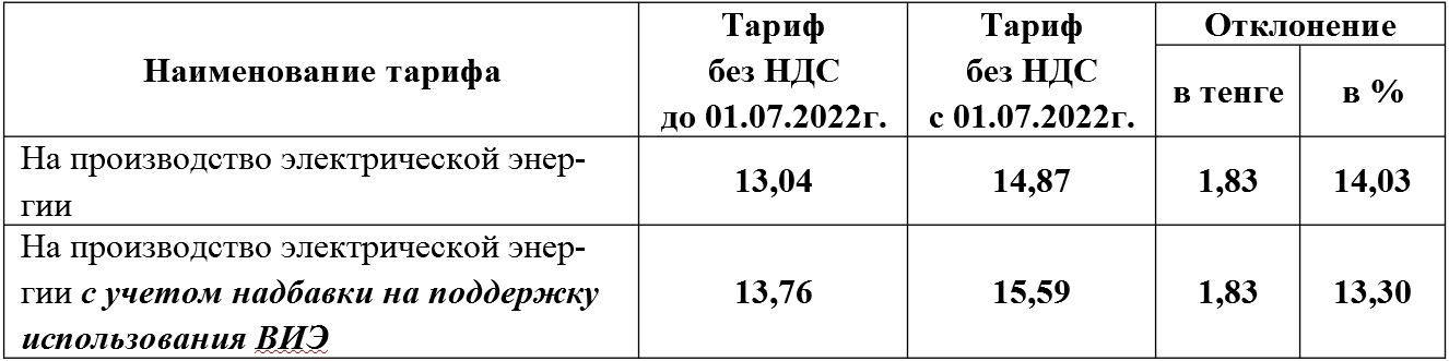 Бұрын қолданыста болған тарифте - 13,04 теңге/кВтс ҚҚС-сыз 2021 жылғы 1 шілдеден бастап электр энергиясын өндіру үшін негізгі отын ретінде пайдаланылатын, электр энергиясын өндірудің өзіндік құнындағы үлесі 65% - дан асатын газға баға құнының өсуі ескерілмеген.