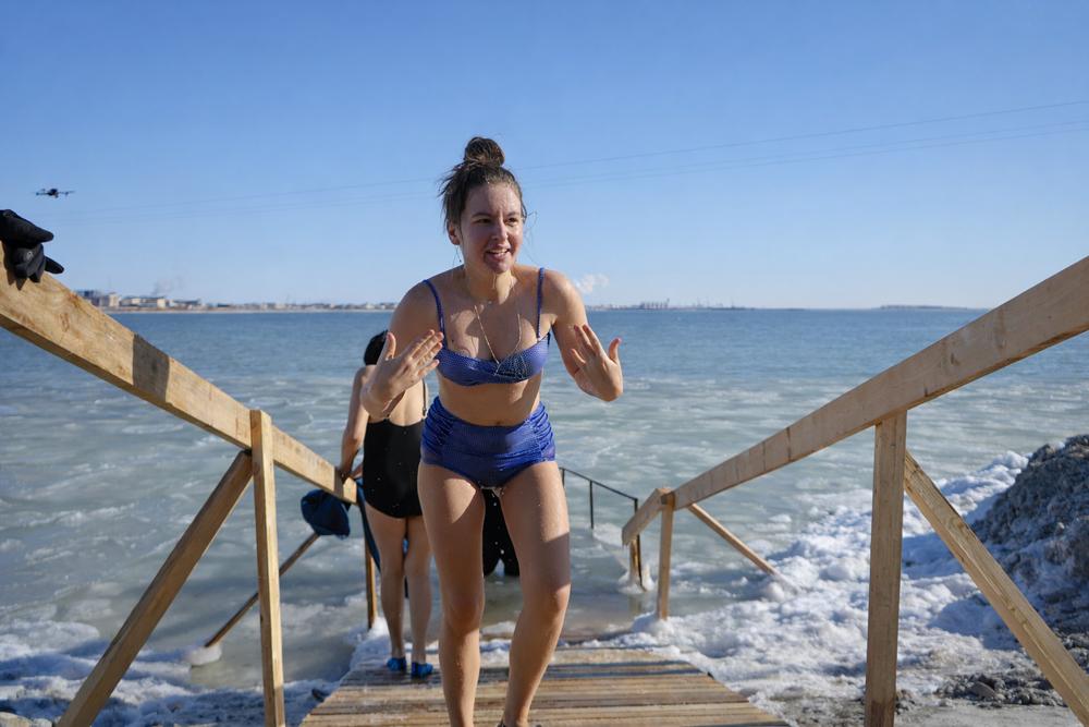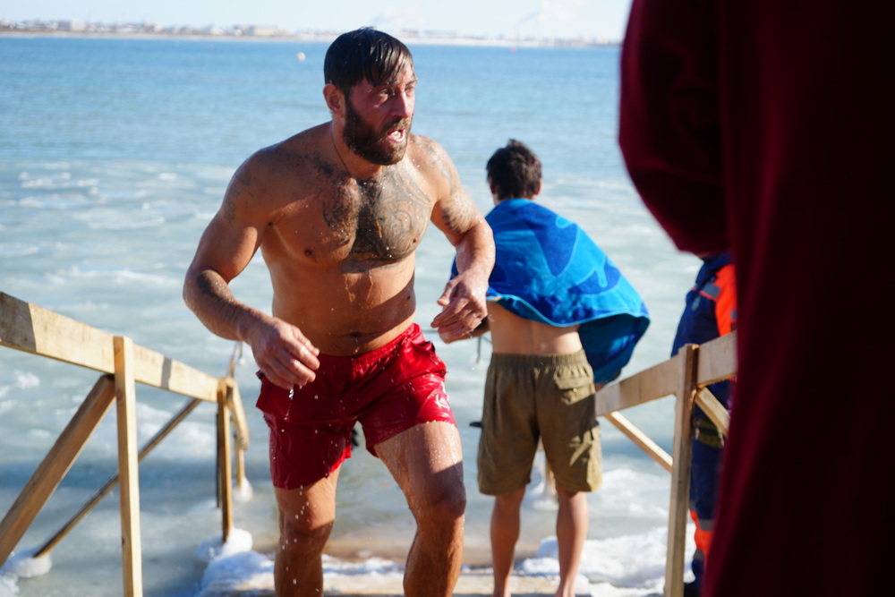 Его друг Александр тоже начал окунаться во время учебы в Санкт-Петербурге. Там вода ощущается намного холоднее из-за северного климата: по его словам, «на выходе из купели колет все тело». Поэтому купания в Актау, отмечают участники, переносятся легче.