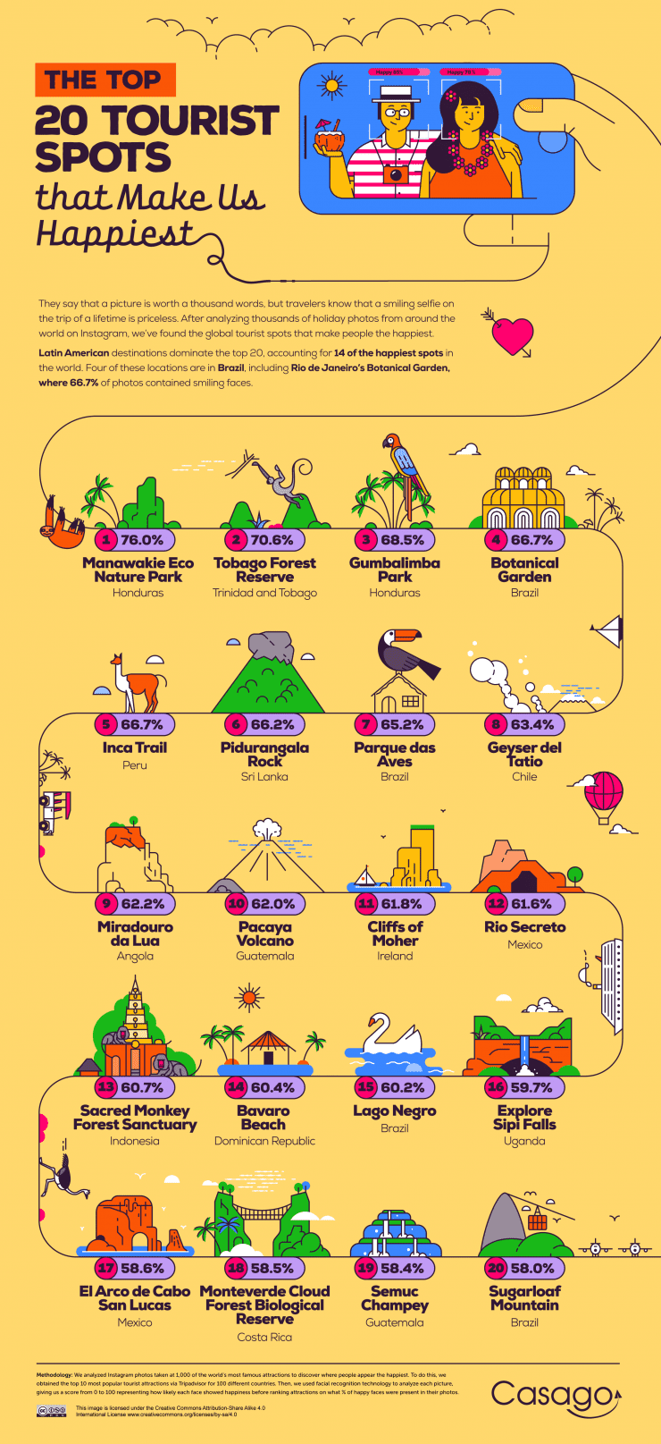 Проанализировав тысячи фотографий из самых популярных туристических достопримечательностей в 100 разных странах исследователи вывели так называемый "индекс счастья".