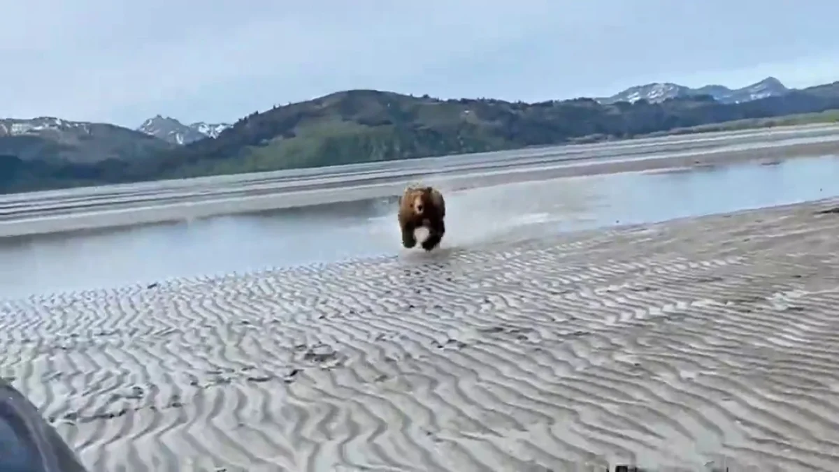 На видео можно заметить двух крупных медведей, мирно прогуливающихся около водоема. Казалось, что животные не проявляют никакого интереса к группе фотоохотников, однако в какой-то момент один из хищников неожиданно срывается с места и на большой скорости бежит на людей.