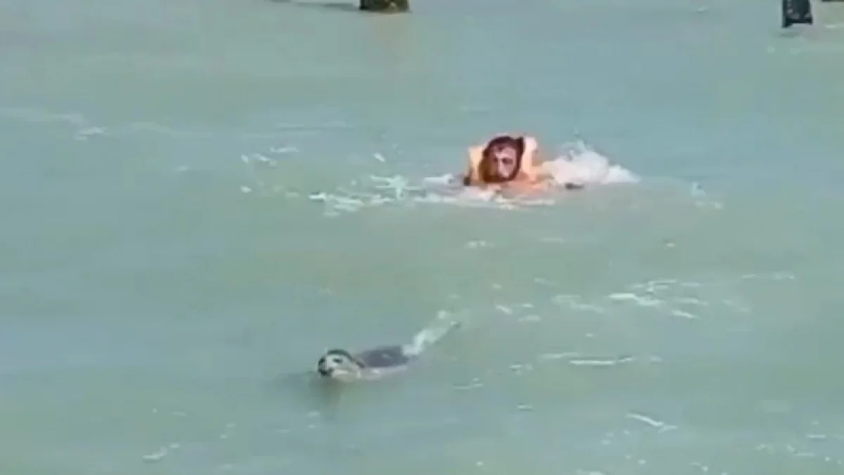 Появление тюленя засняли на видео. На кадрах запечатлено, как морской котик подплывает к купающимся мужчинам, чем вызывает у них бурную реакцию. Один из мужчин уплывает от животного, выкрикивая нецензурную брань.